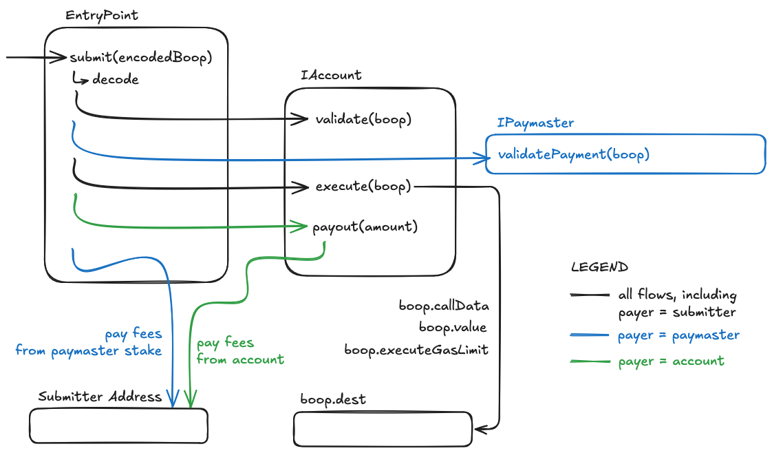 boop.payer === boop.account), follow the black and green lines. - If a paymaster pays for the boop, (