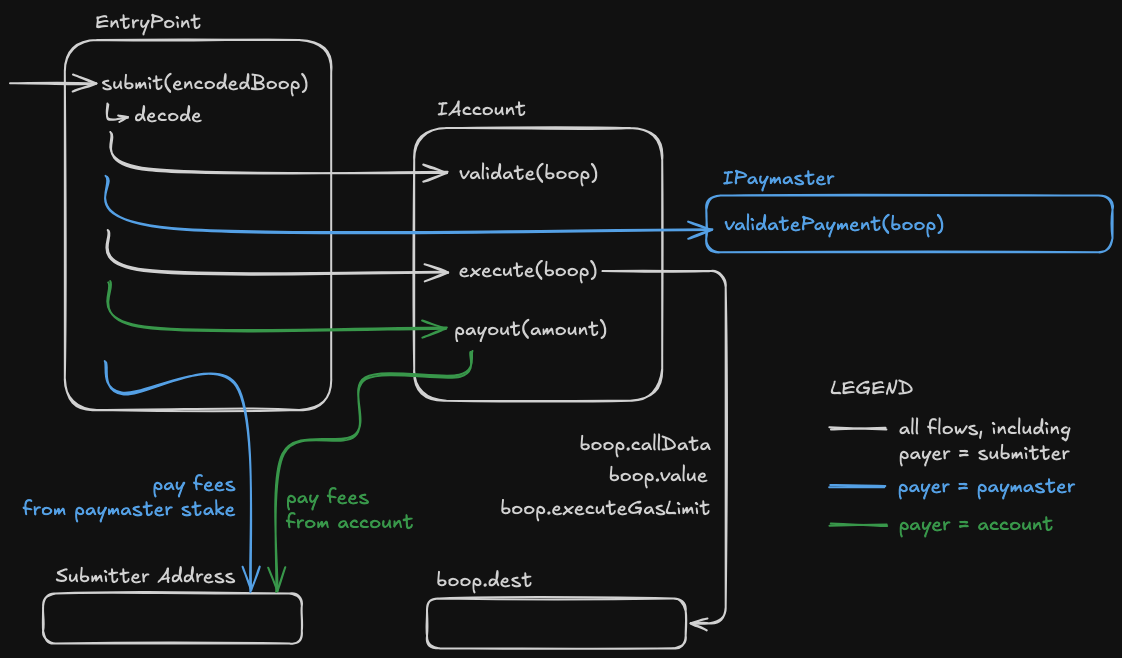 boop.payer === boop.account), follow the black and green lines. - If a paymaster pays for the boop, (